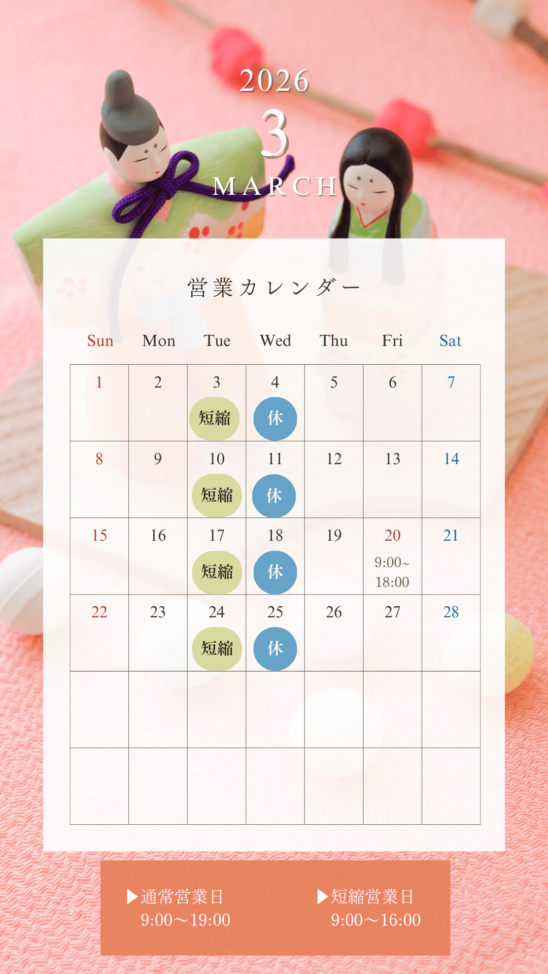 営業時間:9:00~19:00(火曜日のみ16:00まで)