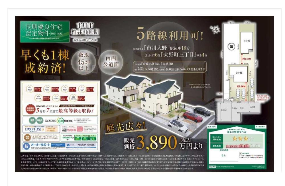 | 交通 | JR武蔵野線「市川大野」駅 徒歩18分 | 価格 | 【2号棟】4,290万円【3号棟】3,890万円 |