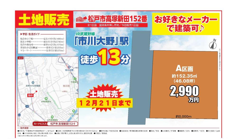 【松戸市高塚新田】期間限定土地販売!お好みのハウスメーカーで建築可能です!|松戸市高塚新田の | 市川市の不動産のことなら優和住宅